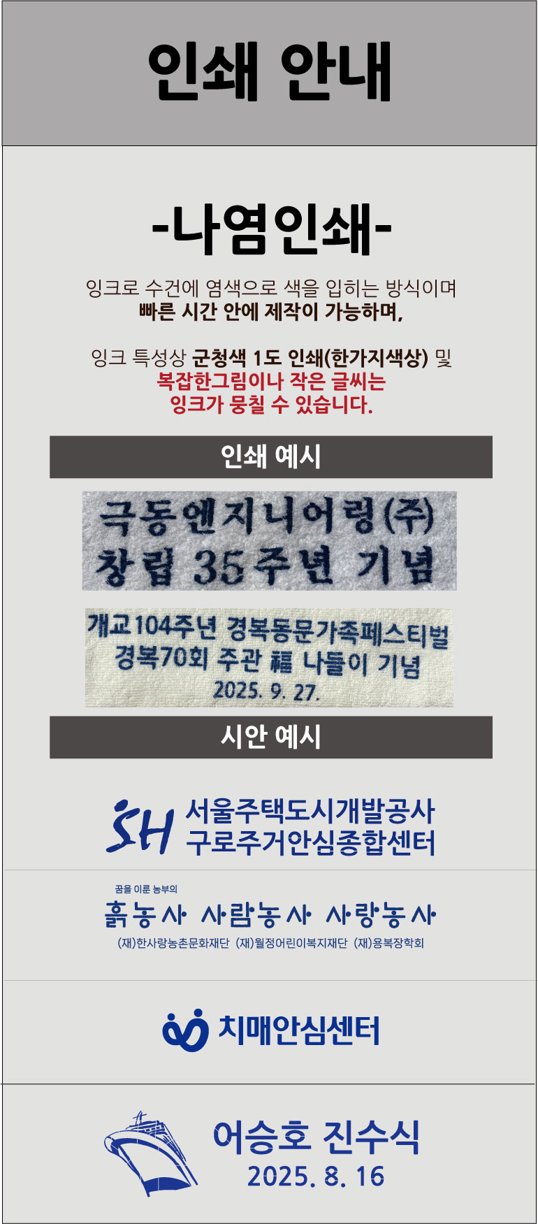 »ö»óÀÇ »ç¼ÒÇÑ Â÷À̰¡ ¹®Á¦ µÉ °ÍÀ¸·Î ¿¹»óµÇ´Â °æ¿ì¿¡´Â »ùÇÃÀ» ¹Ì¸® È®ÀÎÇØ ÁֽǰÍÀ» ±ÇÇØµå¸³´Ï´Ù. - 2 Àμ⸦ ÇϽô °æ¿ì, ´ç»ç¿¡¼´Â °í°´´ÔÀÌ º¸³»ÁֽŠ¿ø°í ¹× µµ¾ÈÀ» ±âº»À¸·Î ÇÏ¿© Çʸ§À» Á¦ÀÛÇϰí, Á¤È®¼ºÀ» ±âÇϱâ À§ÇØ °í°´´Ô°ú ÀçÈ®ÀÎ ÈÄ ½ÇÁ¦ ÀμâÀÛ¾÷À» ÇÕ´Ï´Ù. (ÃÖÁ¾ µðÀÚÀÎ ½Ã¾ÈÀÇ À߸øµÈ È®ÀÎÀº Ã¥ÀÓÀÌ ¼ö¹ÝµÇ¹Ç·Î Á¤È®ÇÏ°Ô È®ÀÎÇÏ¿© Áֽñ⠹ٶø´Ï´Ù.)